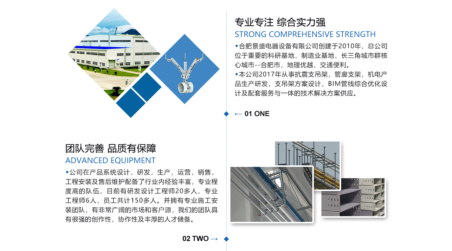 合肥景盛電器設備有限公司創(chuàng)建于2011年,注冊資本3000萬,總公司位于中國重要的科研基地,制造業(yè)基地,長三角城市群中心城市-----合肥市,地理位置好,交通方便。本公司2017年從事抗震支吊架,電纜橋架,機電產(chǎn)品生產(chǎn)研發(fā),支吊架方案設計,BIM管線綜合優(yōu)化設計及配套服務與一體的技術解決方案供應。公司在產(chǎn)品系統(tǒng)設計,研發(fā),生產(chǎn),運營,銷售,工程安裝及售后維護配備了行業(yè)內(nèi)經(jīng)驗豐富,服務程度高的隊伍,目前有研發(fā)設計工程師20多人,工程師6人,員工共計150多人。并擁有施工安裝團隊,有非常廣闊的市場和客戶源,我們的團隊具有很強的創(chuàng)作性,協(xié)作性及豐厚的人才儲備。 公司先后通過ISO9001:2015質(zhì)量管理體系認證...